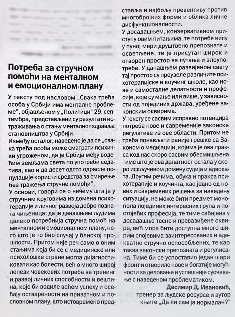 U tekstu pod naslovom „Svaka treća osoba u Srbiji ima mentalne probleme”, objavljenom u „Politici” 29. septembra, predstavljeni su rezultati istraživanja o stanju mentalnog zdravlja stanovništva u Srbiji.