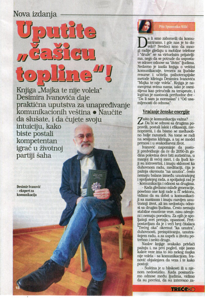 Da li smo zaboravili da komuniciramo, i gde nas je to dovelo? Svedoci smo da mnogi radije gledaju u mobilne telefone i “druže” se sa virtuelnim prijateljima, nego da se potrude da uspostave zdrave odnose sa “živim” ljudima. Nedavno je izašla knjiga o veštini komunikacije, trenera za ljudske resurse i učitelja psihoterapijske metode kliringa Desimira Ivanovića “Majka te nije volela”. Knjiga je namenjena svima nama, iako je osmišljena kao priručnik za terapeute, i logičan je nastavak prethodne dve – “Da li sam ja normalan” i “Od usamljenosti do odnosa”.