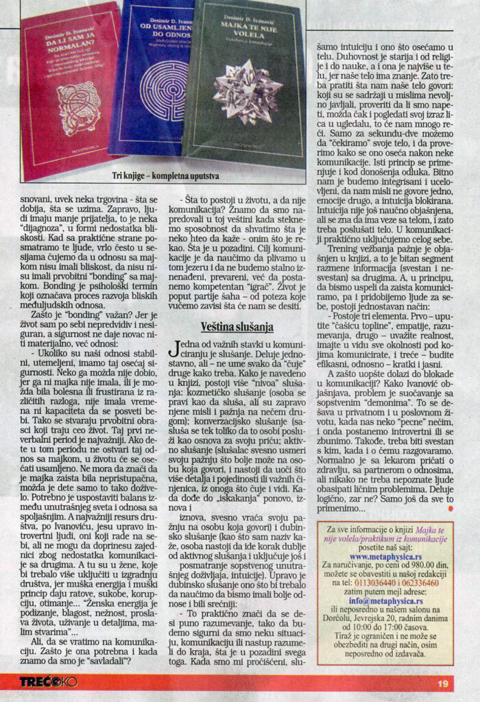 – Kada gledamo mlade generacije, posebno one koji rade u IT sektoru, vidimo da su dobri u komunikaciji sa mašinom i imaju razvijen unutrašnji život, ali im nedostaju odnosi sa drugim ljudima. Često nemaju stabilne emotivne veze, nisu oženjeni i nemaju porodicu. Za njih je spoljašnji svet pretnja, opasnost. Pretpostavljam da je i veći broj čitalaca “Trećeg oka” okrenuta “ka unutra”, duhovnosti, preispitivanju, unutrašnjem radu, a za uspeh u životu potrebno i nešto drugo.