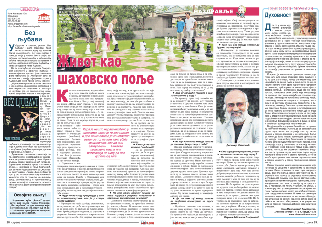 – Na pitanje kako investirati energiju u pravom pravcu nema jednostavnog odgovora. Pravi put se teško pronalazi, a lako gubi. Deo tog odgovora leži u balansu emotivnog, mentalnog, telesnog i intuitivnog dela nas. Ako naš sistem dobro funkcioniše i ako smo postavili ciljeve, onda bi trebalo da gledamo gde su moje emocije u vezi sa tim, jer one su te koje nam daju energiju i moć da nešto završimo. Ne bi trebalo ni da ignorišemo mudrost tela, pa bi trebalo da vidimo kako ono reaguje. Trebalo bi da sagledamo i kako intuitivno to doživljavamo. Po pravilu je to proces, danima smo preokupiranim time i to je sasvim OK. Ne bi trebalo da ga prekidamo, nego da sebi damo dovoljno vremena da se iskristališe ono što je najbolje. Možda je odgovor na pitanje kako da vučem dobre poteze – da to radim kao u partiji šaha, jer stanje igre je najviše životno dostignuće!